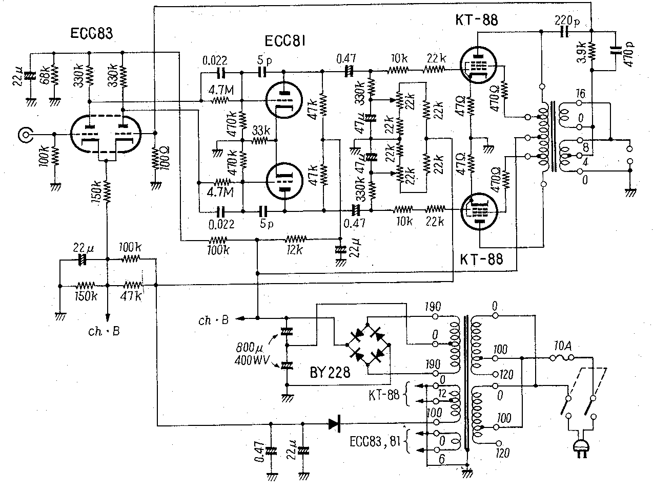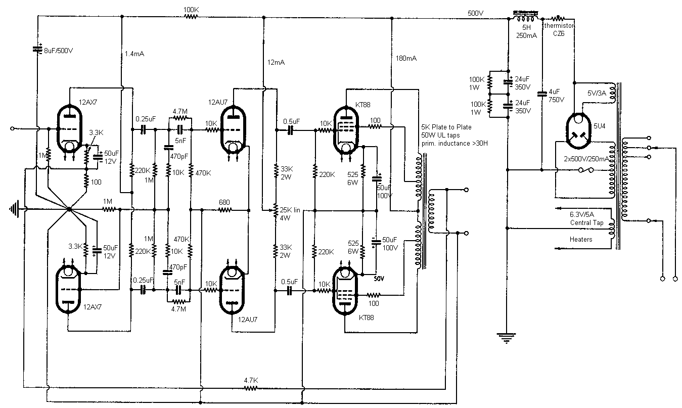 KT88 Schematic by GEC Ltd in December 1957. Power 100W.