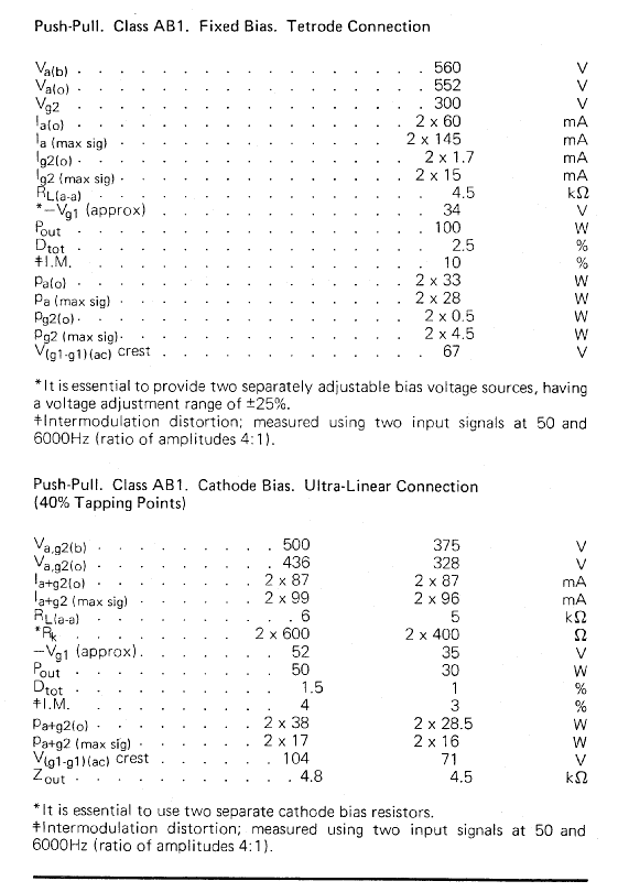 | Typical operation -- P-P, fixed bias tetrode, cathode biased ultra-linear | |