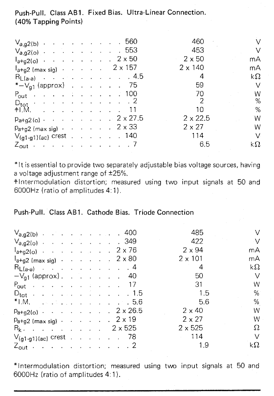 | Typical operation -- P-P, fixed bias ultra-linear, cathode biased triode | |