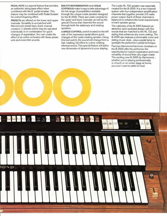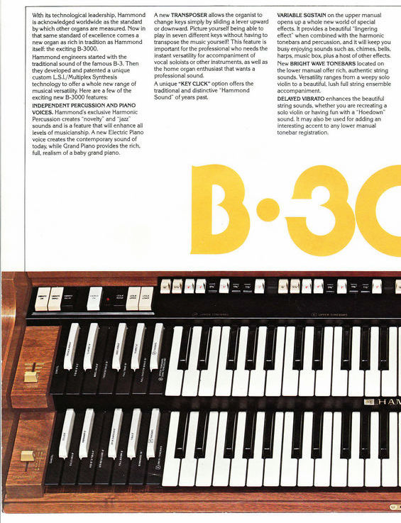 The electronic B3000 was the predecessor of the B3. It looks almost the same, and luckily, they did not stuff it with Gimmicks. This is the nice part of the B3000. So yes it's electronic, but you have the B3 feeling still. From the old Hammond catalog, you can read the intentions: It has no serviceable parts. Some features were added, which would have been nice to have on a B3, but technically too difficult. Such as a string pedal. So B3000 had these painfully missing things. They could not resist adding a piano tone to it, and en electronic piano tone, but that was the only "modern" thing they added. For the rest, at a first glance, you would hardly see the difference. B3000 was also used as stage organ by professionals. Roda Scott played the B3000 for many years. Also Barbara Dennerlein who is a hard core tone wheel player, still performed on the B3000 occasionally.