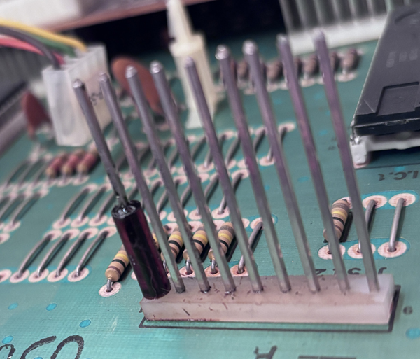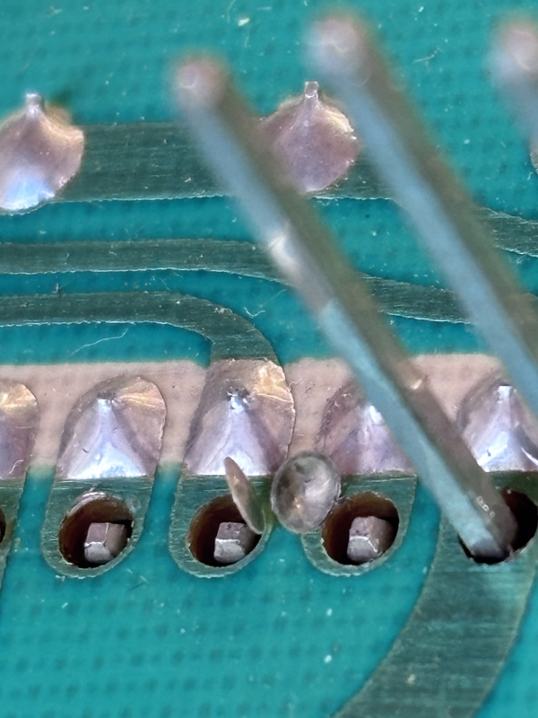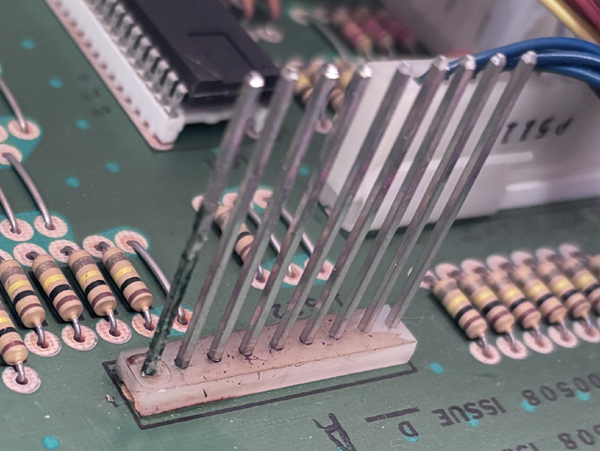 Another issue with the DEMUX board is the space holders. These were at some day in 1980, made of soft, transparent material. Like 15mm pieces cut off some plastic hose. However this material is producing some sticky substance at the inside. This substance feels like glue, and it oxidizes the pins of the connector. Inside is some stuff, colored with green oxide.