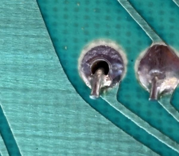 This is the bottom of the middle layer. As you can see, they drilled the PCB from the wrong side, then these things happen. So these little "caps" remained. Untouched since 40 years. I found 10 of those. A company which let's such stupidities pass, just deserves the problems they ran into.