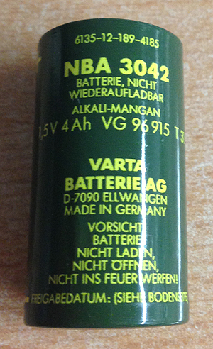 Battery consumption is very low. This is best described by the way it arrived to me in 2012. It came from a military surplus store, and inside were the first Batteries still. (Yes!) They were of the type NBA3042. 4Ah 1.5V Type C, "Baby" cells. They were still full.