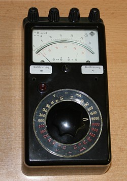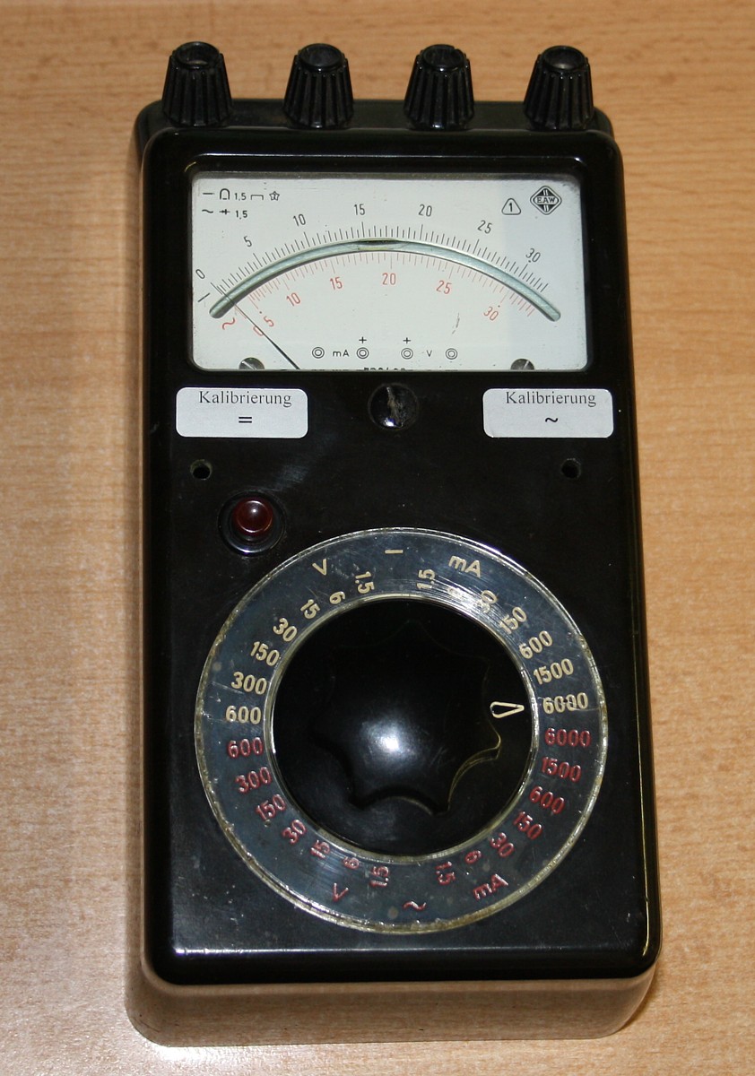 EAW East Germany. Very boring to look at, and I bought it only to calibrate my AVO tube testers, because it has the same impedance as the AVO-8 multi meter, and I needed one. A good AVO8 is very hard to find. WIth the EAW however I realized what this is, when I received it. It had a tout band meter with mirror scale, and that is usually a very good meter. So a tout bad is friction free, more sensitive, more precise, more linear, and more expensive, and more everything. Later, I finally found a good working AVO8, so I sold this EAW meter so somebody who indeed is working on AVO testers as well. But this meter works as nice as it is bad looking. It has a one calibration pot meter inside for AC and one for DC in general. So it was designed with precision in mind. It was easy to drill two 3mm holes a hole in the deck, and then I could can calibrate the meter from the outside. This gives the option to calibrate for instance a particular DC range, let's say the 30V range. Set it exactly right, and then use this for what I want to do with it. Since these meter looks really ugly, nobody even looks at them in Ebay. I payed only 7 Euro, but when someone puts them for auction beginning at 1 Euro, you may as well be lucky for 1 Euro. What is nice, it has separate banana connectors for voltage and current. (So the four you see at the top) and they did some intelligent switching at the inside. You can hook it up the four terminals to a circuit. Two for the voltage and two for the current. Then change from voltage to current measurement without having to plug cables, as with almost any other multi meter. After playing with this EAW, I realized that they ALL saved on this fourth banana connector. So you can buy a 500 Euro fluke, but you don't have this option.