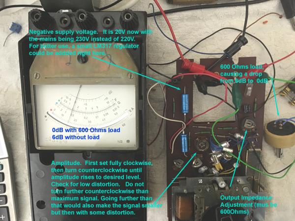 Calibration of internal oscillator. The oscillator is what they write "a normalized 600 Ohms source". I had no idea what that was, and what this is used for. I found this was normal in the days of analog signal transmission, and everything was always in dB. This is nothing but a 1.55V signal with precise 600 Ohms in series. So it drops to 50% if loaded with 600 Ohms. Calibration is needed because the mains is now 230V instead of 220V. The oscillator rejects this difference somewhat, but sure not completely. It would be a good idea to add a voltage stabilizer inside. There is enough room. Anyway I recalibrated it for 230V. I have no calibration instructions, but obviously one pot meter is for the output impedance, which must be 600 Ohms, and one is for the amplitude. So adjust the impedance, load the oscillator with exactly 600 Ohms, and voltage must drop from 1.55V to 0,775V. If that is the case, both pot meters are set right. With enough trying you'll get this done.