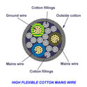 3x 2.5mm This cable can be used to make very high quality mains cables yourself. This cable is designed to have high flexibility, and yet very resistant against stepping on it or other accidental abuse. The PVC shield is very strong, and flexible still. So any wear out at the position where is is mounted into the mains connector, sure is not happening. The inside the cable is with many soft cotton fillings. You will be surprised about how pleasant this cable is to work with! Maximum voltage 230V AC. The three internal mains wires have an isolation of high temperature rubber. (So not PVC isolation)