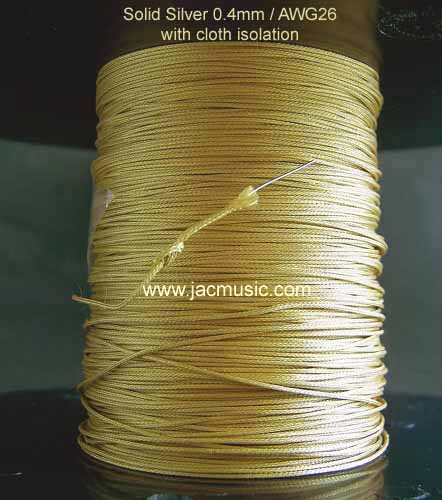 Solid Silver Wire, with 1mm outside diameter, and inside is a solid 0,4mm /AWG26 silver wire. The cloth is cotton. All colors we use, are from the color chart, and are chosen like the colors you see in old radios. This thin and fine woven cloth will make the cable flex with a very good "feel", and it is ideal for making DIY phono cinch cables from it. Also very nice for complete wiring inside amplifiers. The cloth has no high voltage isolation properties. It can only be used for audio input signals.