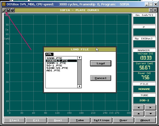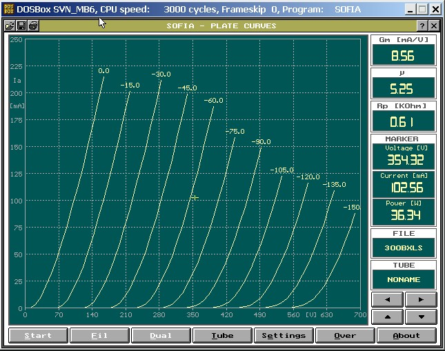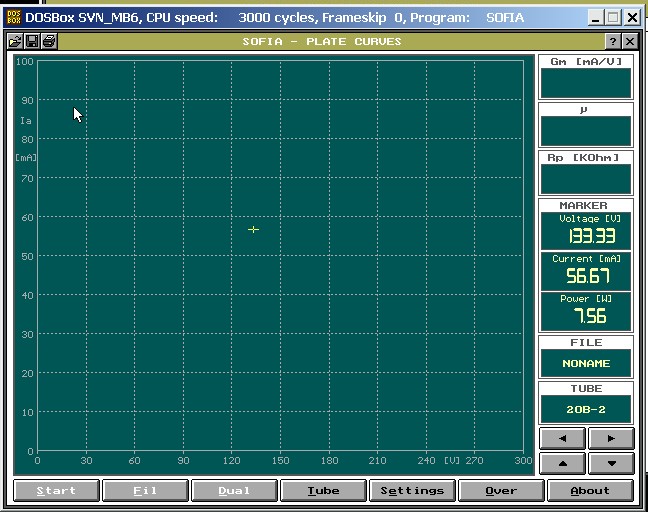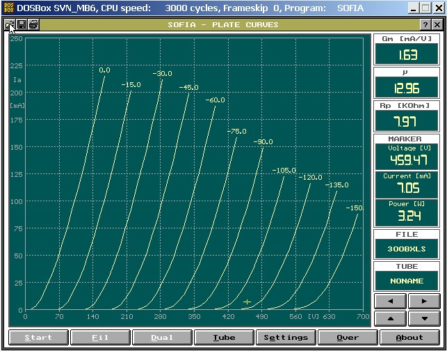 What follows here is a guide to install and how to use the SOFIA curve tracing software. However your PC must eb able to run DOS. For XP or lower, the PC can do it this. For W7 or higher you need to install a DOS emulator program (freeware) or a windows  XP emulator.   You need no knowledge of DOS, since the Sofia program works the same as  earliest Windows versions.  This software once belonged to the very exclusive Sofia tube tester, but it can be used also without a  tester, when you have the tube curves filed at your PC disc. Then you can still do following things: