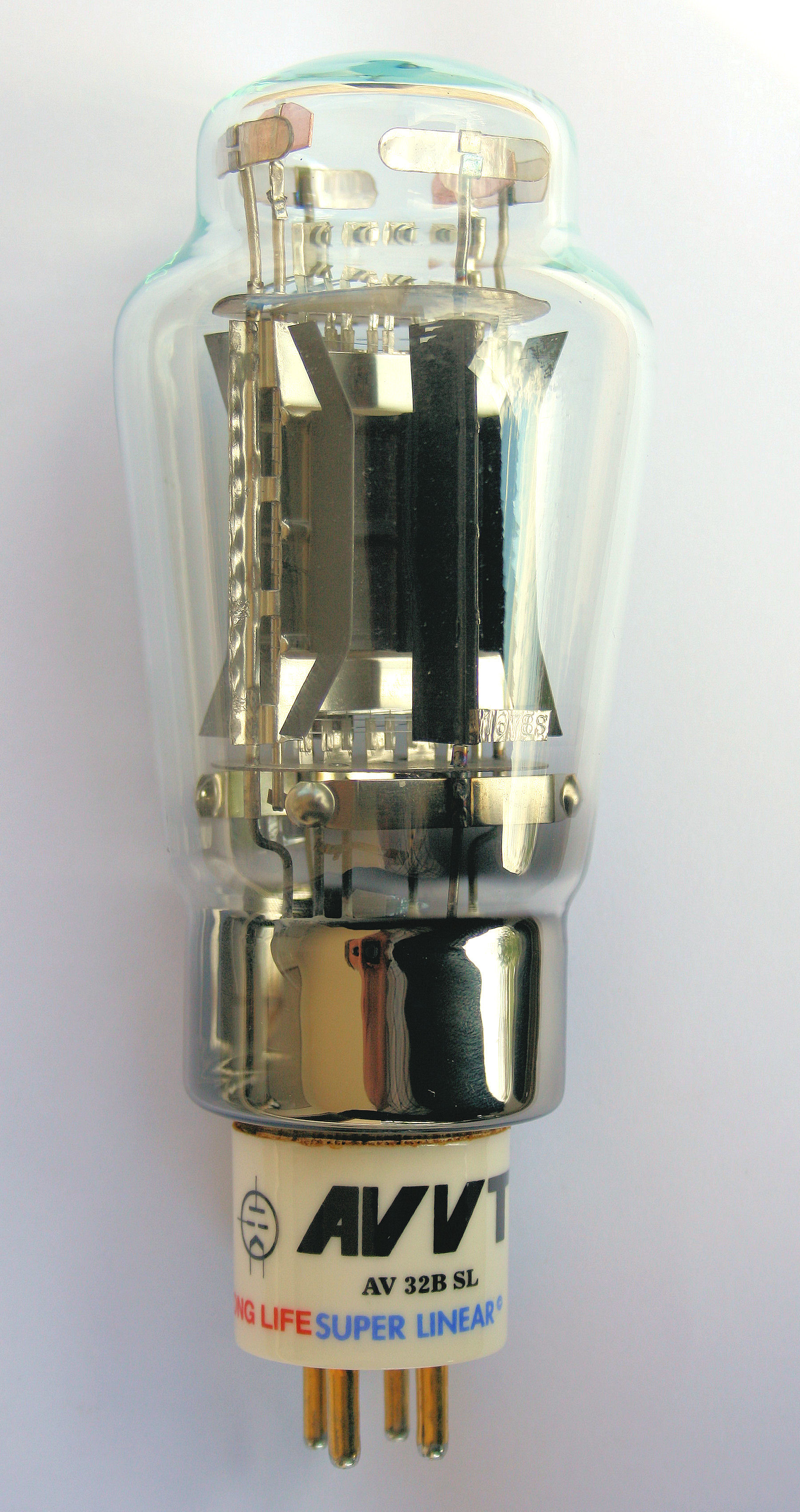 Note 1) Super Linear platesare based on an exclusive AVVT patent. The cold ends of the filaments do not have a very good function, and cause distortion. This tube has four cavities inside the plate, that cover the cold ends of the filaments. These cavities are covered by four nickel plates, that you can see from the outside. Within these cavities, plate current will not be able to flow, and this disables the emission of the cold end of the filaments.