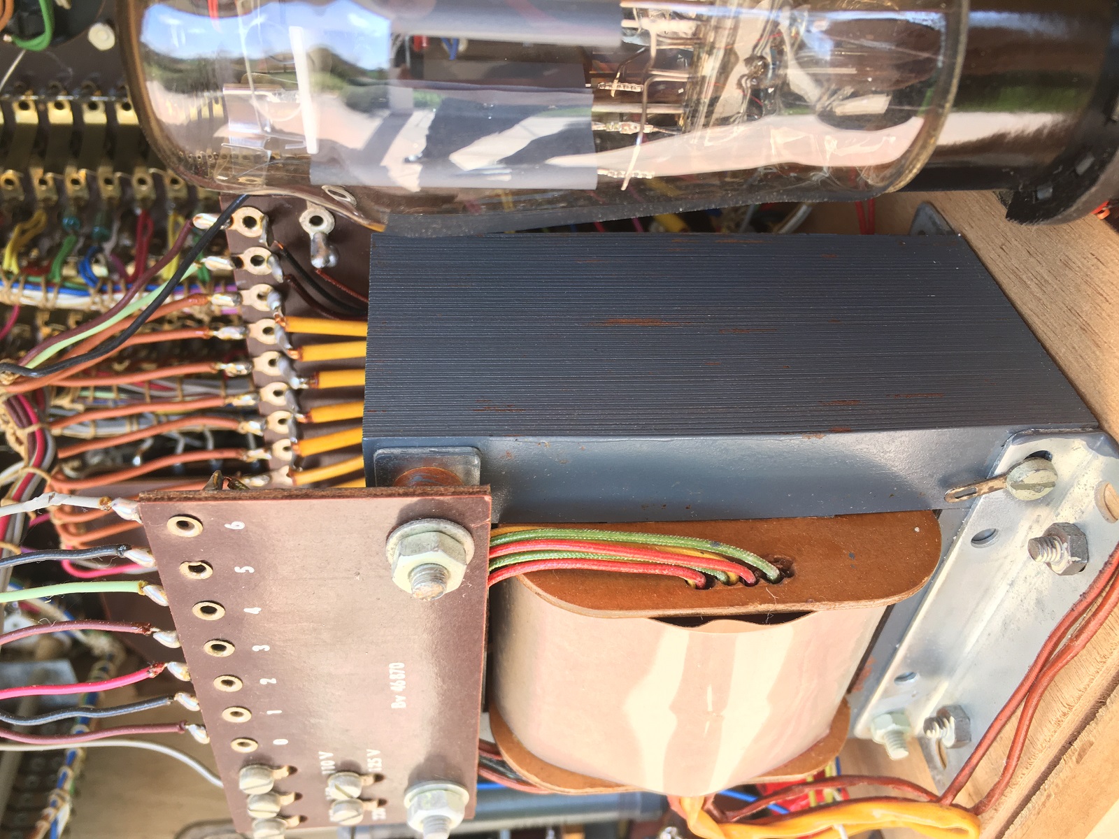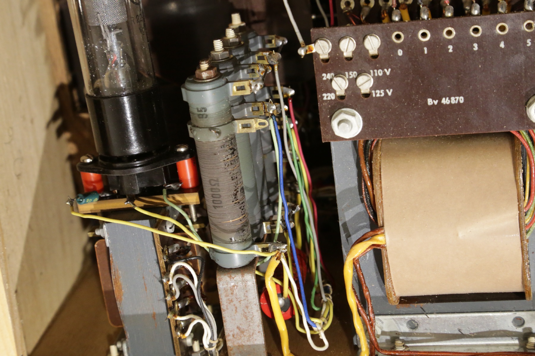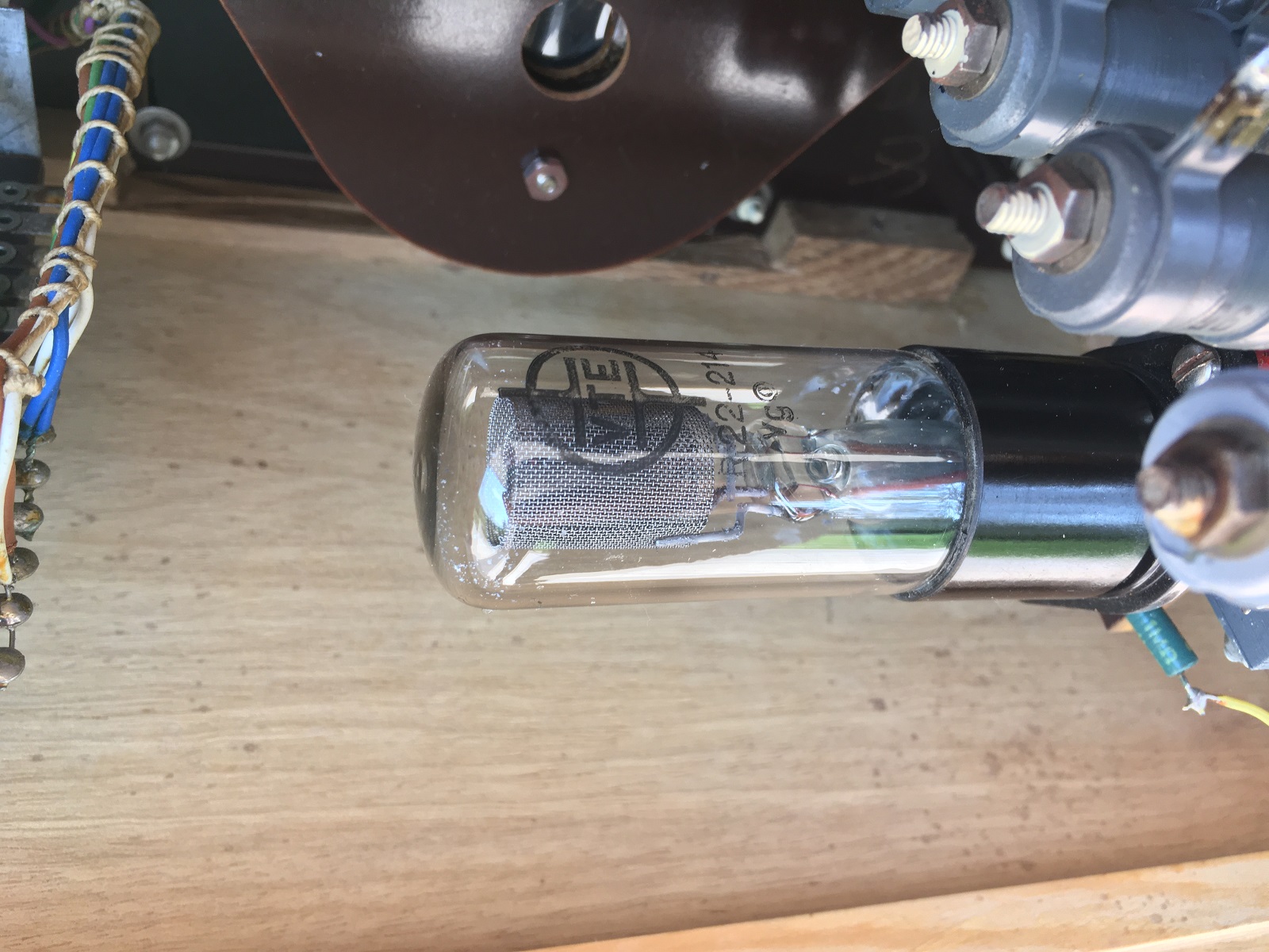 Close up of the stabilizer tube. This tube, when heavily used will become somewhat silvery or grey on the glass inside. Though such a tune will normally deliver it's 150V, it's internal resistance is higher, meaning the load characteristic is not as intended any more. Some tubes react quite strong to that, and that would give a wrong reading. These original (Funke qualified GR150, not just any GR150) have a fully flat load characteristic when new. At end of life, the burning color gets darker, and the internal resistance goes up. Needless to day, this this is new condition.