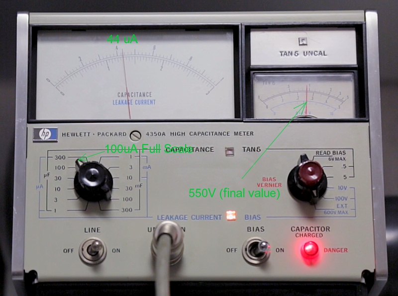 Capacitor leakage at 550V (final result), with only 44uA (so little!) leakage current. Such a capacitor is of excellent quality. No need to replace.