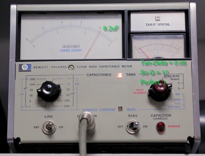Before switching on, I reformatted the capacitor, because I prefer to let the original parts in, when still good. However simply "switch on" such an old capacitor will damage it. At first it will resist no higher voltage than 50V, and draw several mA if you try. Then it works the same as charging a battery. So voltage goes up very slowly, as long as you give it charge current. Yet with capacitors this should be in the 50uA range. Then at 500V it more or less stopped "charging" and began to need more time. Yet when waiting long enough and at very little current, it would charge up to 550V and I stopped at that point.
