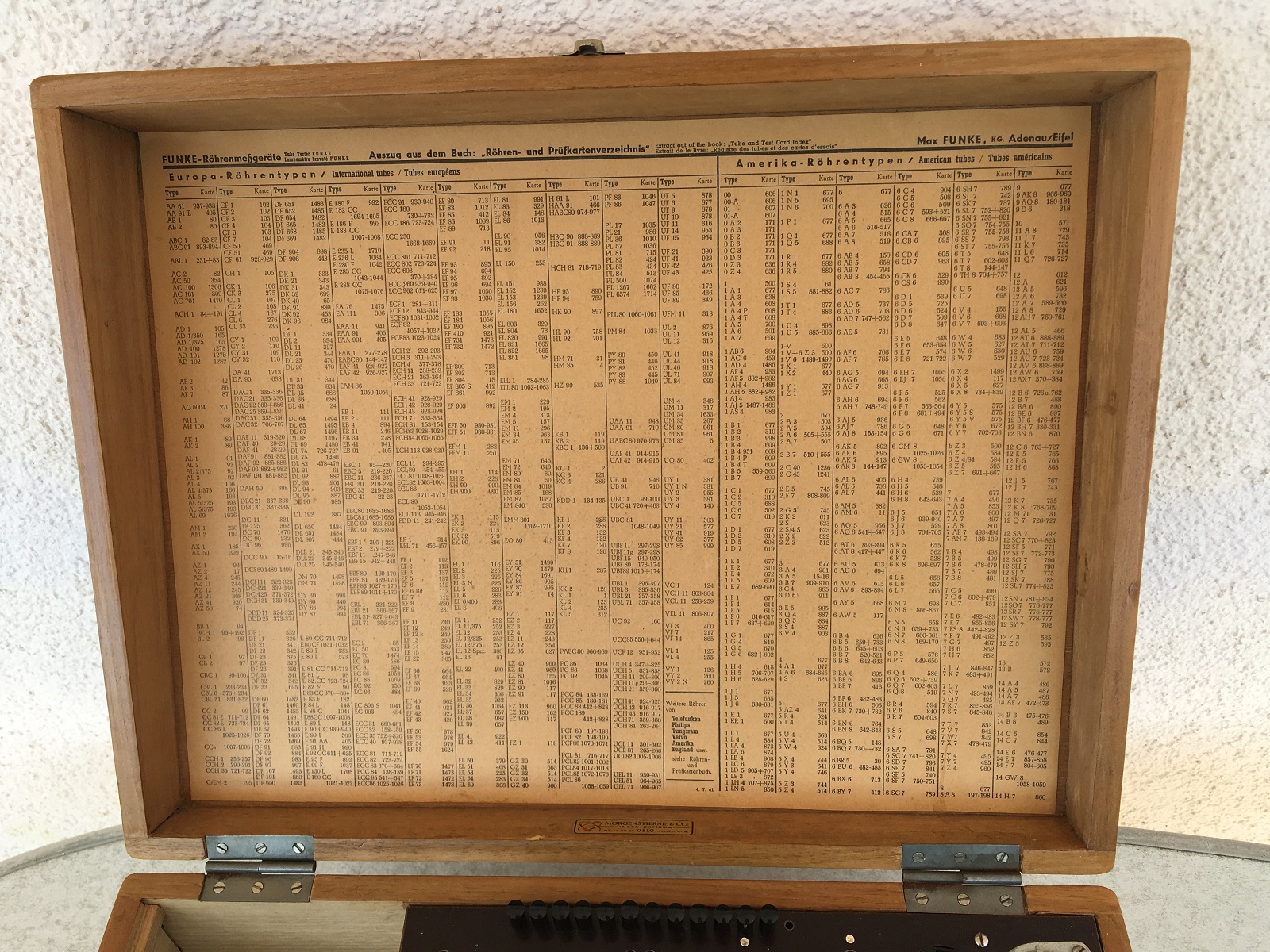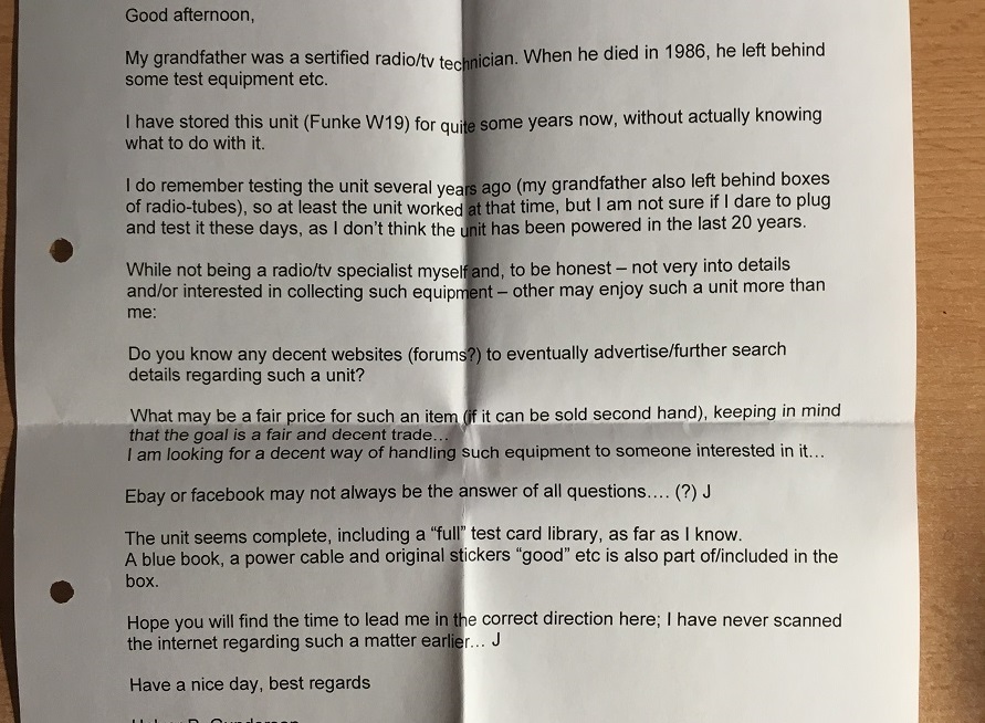 I am not a fan of "stories" with equipment, but this one has a story, and it's good story. It was sold new, by the Funke company, to a Norwegian Engineering company, called MORGENSTIERNE, in OSLO. Where it was just stored ever since, and almost never used, until the owner died in 1986. His son inherited all items, including the house, and he never did anything with the equipment. As his son retired 30 years later, he sold the house and the whole rest. This is how I got the tester.
