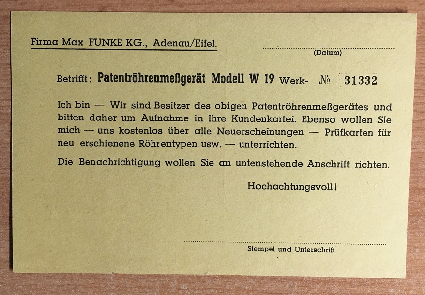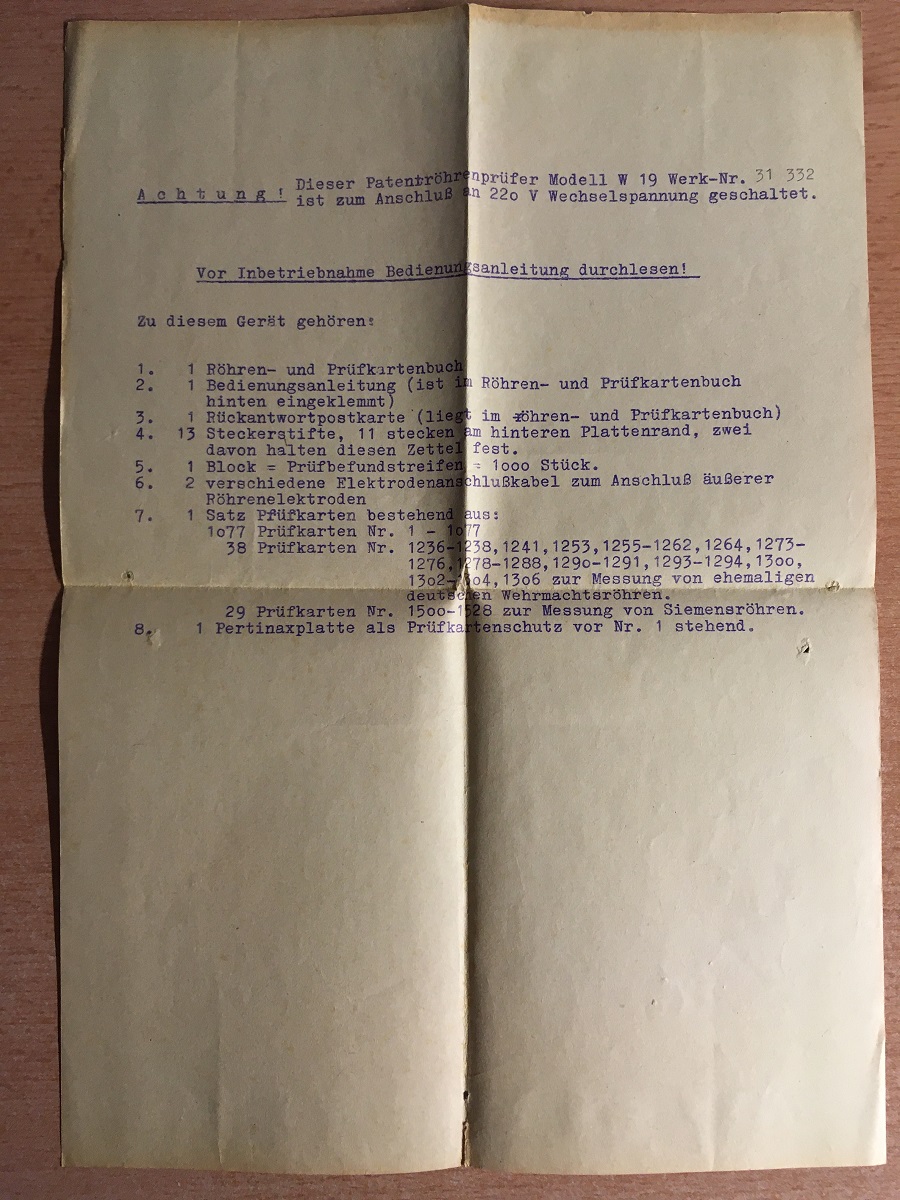 This is the delivery note. That little card was item 3. It is a pity there is no date on it, so we don't really know how old this tester is. However the blue book which is along with it, carries the tester's series number, and the latest adding in this book are dated 1962. So the tester is from 1962 or later.