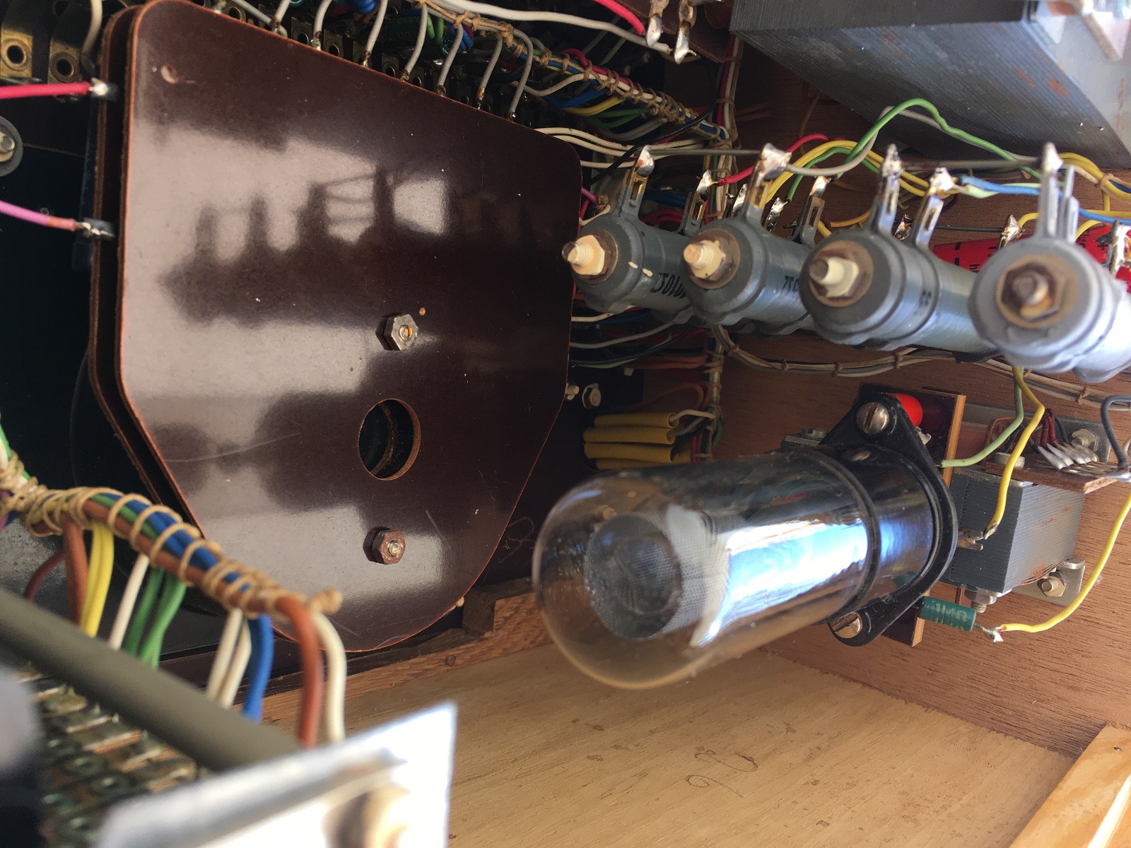 Here you can see the only repair I needed to do. The resistor of 1000+95 Ohms has seen some heat. So I took it out, and the resistance values were perfect. I have repainted it with heat resistant grey paint, and put it back in.