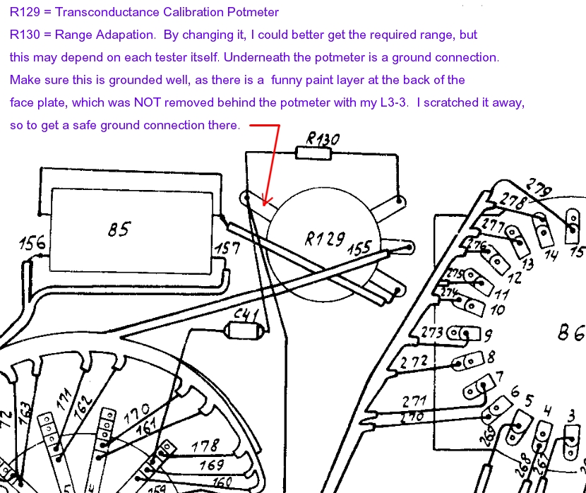 Change of the Transconductance Calibration pot meter before a transconductance measurement, you need to calibrate this circuit. This method greatly improves the accuracy of the measurement, making the L3-3 probably one of the best (or THE best) tester there is, for transconductance measurements. Measuring transconductance with an audio frequency AC signal is the best way, as this eliminates the mains hum. (and this would make your Gm measurement be wrong). Mains hum also comes in when you approach the tube with your hand. Another factor is tube unlinearity, will make the Gm measurement not accurate, because unlinearity is just a form of distortion, and distortion ADDS harmonics to the signal. These harmonics will increase the Gm reading, which is a measurement error. For this reason the L3-3 works with a VERY precisely tuned band-pass filter. However since this circuit is temperature dependant, and since the aim is precision, you need to calibrate this before beginning to work with the L3-3. Only thing is, this calibration needs to be done too often. This is what pot mter R129 is for. Sometimes before every single measurement, which is annoying when using the L3-3 for testing many tubes of one kind. I found when the pot meter R129 is replaced by a wire wound 10-turns pot meter, the circuits stays stabile for a much longer time, and working comfort increases significantly.