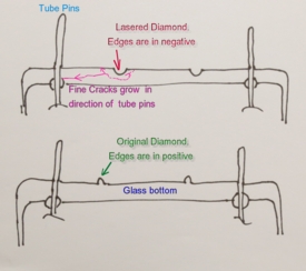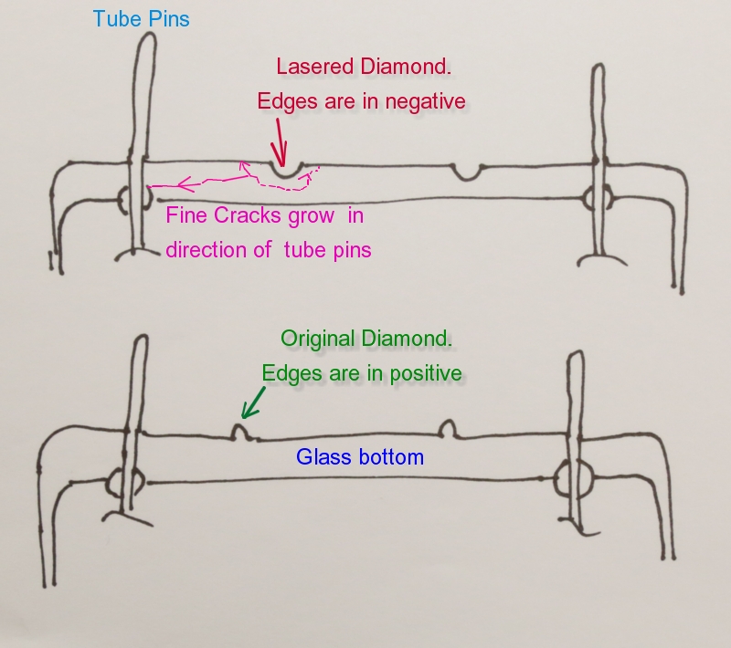 I quickly made this sketch as it tells more than words. Also in the next picture, I show you the glass cracks. They did a really nice job, actually melting the surface, and also achieving the original dimensions. The surface does not look lasered at all, and it has indeed identical surface like original diamonds too.