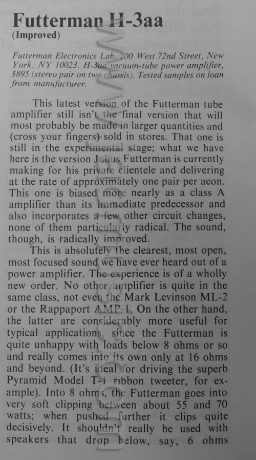 Please first read this interesting test above, in 'The Audio Critic'. The writer has a comment about the feedback method in this amplifier, and also about future unavailability of the 6LF6 tubes. Then read the comment on that, by Julius Futterman. 1979 Letter by Julius Futterman,to the Editor.'I am pleased with your evaluation of the sonic virtues of the H-3aa power amplifier but do take exception to two of your assertions : 1. The power tubes I use (6LF6) are being manufactured in the USA by GE and Sylvania. They are also being made in Japan and Yugoslavia. I have been informed that they will be around for many years. In your Vol. 1, No. 3 issue, page 4, you wrote that the Berning hybrid tube amplifier using 6LF6 tubes will be manufactured by Audionics. Also please note: The Acoustat X ($2.200) uses 6HB5 tubes, which is also a TV tube. This tube was used in my H-3 stereo amplifier in the 1960's. The Beveridge 2SW-1 ($7.000) uses 40KD6 tubes, also a TV tube. My point is at these two types are of even older vintage than the 6LF6 tube, yet you did not caution a buyer of the Beveridge system about their not being able to obtain them in a few years. I am sure if tubes do a better job in an amp or pre amp they will always be available from one source or another. 2. Before taking up the second subject that makes me unhappy I would like to digress for a minute, if I may. Before transistor amplifiers the rated impedance of most high fidelity speakers was 16 ohms. In Britain practically all speakers were 15 ohms. There were sound reasons for this as, all other things being equal, a higher impedance speaker is more efficient and the crossover design is not as complex. We are referring, of course, to moving-coil speakers. 3. The reason for the lower impedance of speakers today is, of course, the fact that transistor amplifiers, being voltage limited, provide more power for such speakers. As an interesting aside you implied in your review of the Tangent RS2 (Vol. 1, No. 5, page 25) that it was an inefficient speaker as you were able to make the Levinson ML-2 clip on it with a master tape of piano music. On the other hand, I can make the Tangent RS2 play very loud with the H-3aa. The reason for this is simple : The impedance of the RS2 at 70 Hz, for example, is 11.5 ohms; at 500 to 2000 Hz it is 9 ohms, and it rises steadily to over 20 ohms at 6 kHz, which is well above the fundamental tones of the piano. With the ML-2's 14 volt maximum voltage rating you can see that there is very little power to drive the Tangent. End of digression. 4. Electrostatic speakers are inherently of high impedance and this is lowered by means of a transformer. The Acoustat and Beveridge speakers use a different approach. They do not use a transformer; instead they employ very high voltage amplifiers to drive the speakers directly. The KLH-9, Quad, and Koss are examples of speakers using transformers. In general, the lower the turns ratio of the transformer the better the speaker because of tighter coupling and other factors that 1 will not go into here. The KLH-9 impedance is 16 ohms, the Quad 15 ohms and the Koss 4 ohms The KLH 9 and Quad were designed for tube amplifiers, the Koss for solid state. Thank you for allowing me to comment. Sincerely yours, Editorial Reply to Julius Futterman's LetterIt was unquestionably a miscarriage of justice that your amplifier was singled out for our general caveat about the future of vacuum-tube audio equipment. What's true of one particular design is true of them all: their longevity depends on the TV replacement market, the Russian aerospace industry and other factors outside the world of audio. We seriously doubt whether audio manufacturers by themselves could keep even a single vacuum tube factory in business through the 1980's. On the other hand, you may be quite right insofar as these other demands may preserve vacuum tubes from extinction for decades to come. Your guess is as good as ours or anyone else's. The rest of your comments all point to an implicit conclusion we have shared for quite some time, namely that the power amplifier and the loudspeaker should be conceived and designed as a single system, the "back end" of the audio chain, not as two separate all purpose modules that never quite mate optimally. The trouble is that very few audio designers have an equal mastery of both disciplines. For example, neither the Acoustat nor the Beveridge amplifier is as highly refined as yours, although their philosophy of integrated design is certainly valid. -Ed. The Audio Critic , 1979 Note by Jac about the use of 6LF6: Audio Critic makes a guess in 1979, about why TV tubes used by Futterman will soon become unavailable, and they write audio manufacturers cannot keep one single tube factory alive. Well, there is really a fundamental mistake in the reasoning of Audio Critic, and that is not because they could not know about tube HiFi being so popular now. It is rather not doing the math right. Tubes like 6FL6 were not used anymore for new design TVs somewhere around 1975 or so. But indeed, the TV replacement market was huge. A color TV used three of them. So the replacement market was accordingly large. One way or another, millions of 6FL6 are stored on boxes, barns, garages and other places. From this, some small supply of 6FL6 will always pop up. Probably small quantities, but it will occur very often. Just because they were made in such massive quantity. The situation would be totally another if we would be talking about a tube of which few were made ever since, and now everybody wants it. Like Telefunken ECC803S. That is very difficult of course, but with 6FL6 it is really the opposite. In addition, there is also the possibility some industry stock pops up, and then for a while there will be many for sale. About EL509:Theoretically it could replace 6LF6, but he EL509 market consists mainly of junk and fakes. The Russian ones can do only 0.5 Ampere, which doesn't even come near t