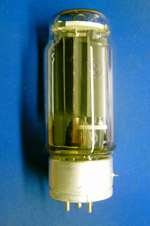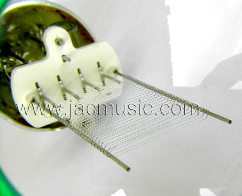 Most GM70 found, have Carbon Plates. The plate of this GM70 pictured here, is made from copper. This process can be found with some very high quality tubes from England, such as Mullard ECC81, or Cossor GZ37 rectifiers. Also the glow image is nicer, because the inside reflects in copper color. As users of Chinese 845 will experience sooner or later, these can have whisker noise, This comes from the electrical connection to the anode, which is (and only can be..) a shrink connection. With this GM70 version, that problem was overcome with the copper anode, to which you can normally weld something. The bars, on which the anode is connected were hard-metal, I can tell so from cutting them off. They are from Molybdenum. This is so hard, it damaged my cutter tool. I used to buy 845 and 211 from China, but the way they pack them, like apples, this caused some 5% dead on arrival, and confidence in the other 95% is low. This kind of problems I have never had with GM70. So for me, GM70 is a 10x better alternative to 845. |