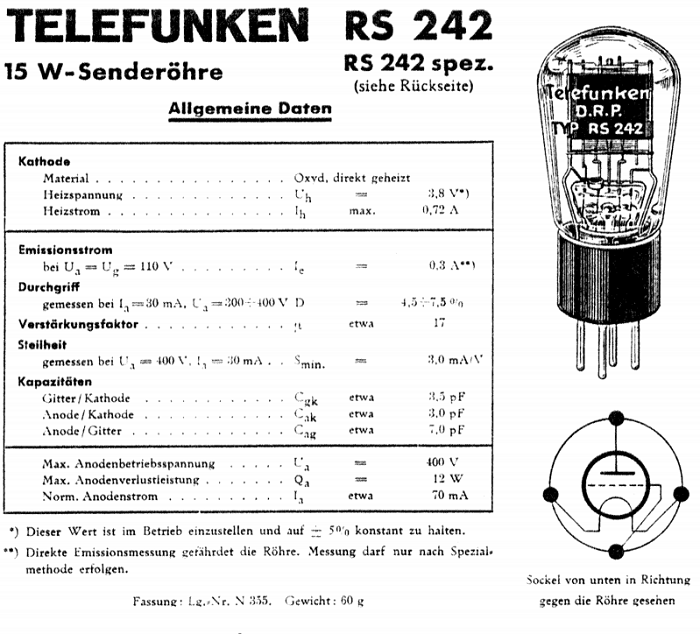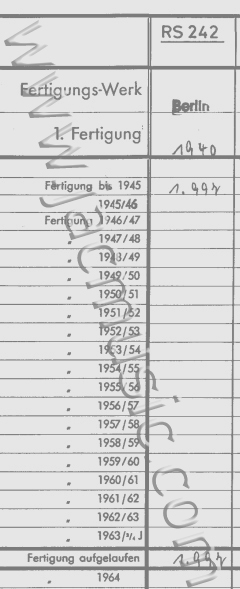 This tube was only made by Telefunken under the RS242 designation. Here is a small cut out, of the complete production data of all Telefunken tubes. As you see there, this is a WW2 product. Production started on 1940, and ended in 1945, with a total of 1997 pieces only. I do not know how reliable this quantity is registered, but I doubt it is correct, given the still reasonable NOS supply even today.