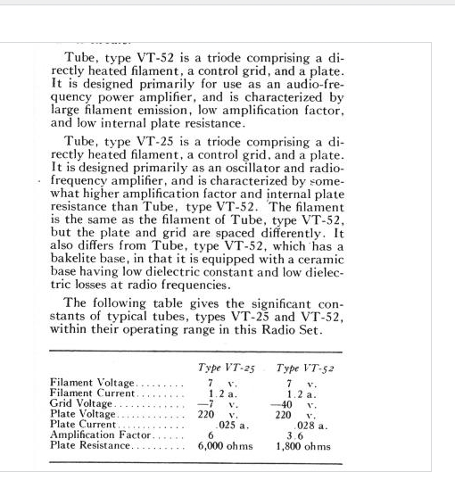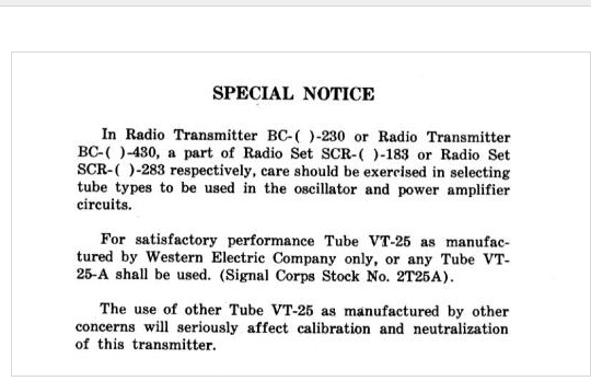 This particular tube is a special situation, and it helps to understand better what happened. There are fragments of informatiom found in the Western Electric Service manual for their airplane transmitters. However, this is helpful, as they are a manufacturer of the tubes, and manufacturer of the amplifiers at the same time. By reading those rare documents we can draw some valid conclusions. We combine this with the knowledge, that all VT25 made by Western Electric are Barium oxide coated tubes, so no Thoriated Tungsten heater type. There are very rare copies around of the Service documentation for Western Electric transmitters, like BC230, BC240,SCR183 and SCR-68-A.