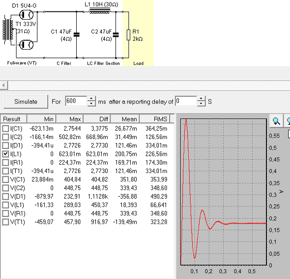 Another reason is the choke saturates at switch on. At that moment it stops being a choke, and what's left is a 30 Ohms resistor. Which is very low, in case C2 is still empty. It can theoretically give 30 Ampere, but of course the rectifier can't do this. All it CAN do, is produce it's "short" current. And it will. This gives a spark, and the rest of the explanation is the same as above. So will the choke saturate? Look below, the simulation program comes up with 600mA peak at switch on. The choke we uses here, is a Lundahl LL1673 10H type, which can deliver 200mA, and it saturates at 290mA. Yes, you are right, not a big distance, but that is normal with chokes. This peak is normal, it results from the empty capacitor C1, but also from a resonant effect, at switch on, which is normal.