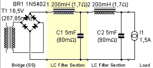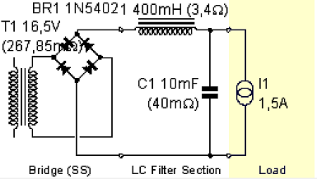 The curious situation is, the transformer gives a normal sine wave voltage, but current is a square wave. Which as well could be called a DC current, of which the polarity is reversed. So, after the rectifier we have a DC current indeed. It gets even better. Do you think the diodes forward voltage, obstruct this nice square wave perhaps? No they don't! The choke simply compensates any voltage at all, by generating such a voltage, positive or negative, as needed to keep the DC current of 1.5A flowing, no matter what. It even compensates it's own internal resistance. This is the amazing property of this circuit.