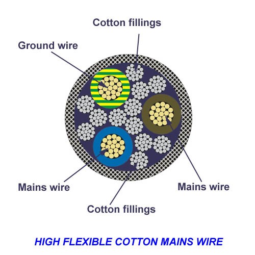 3x 2.5mm This cable can be used to make very high quality mains cables yourself. This cable is designed to have high flexibility, and yet very resistant against stepping on it or other accidental abuse. The PVC shield is very strong, and flexible still. So any wear out at the position where is is mounted into the mains connector, sure is not happening. The inside the cable is with many soft cotton fillings. You will be surprised about how pleasant this cable is to work with! Maximum voltage 230V AC. The three internal mains wires have an isolation of high temperature rubber. (So not PVC isolation)