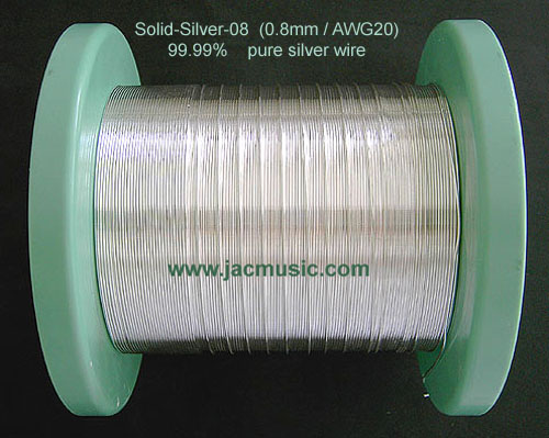 Make your own silver speaker cable with this!Solid Silver Wire, with a solid 0,8mm /AWG20 silver core, soft out glowed. This cable is double isolated, and the resulting cotton isolation is very strong, and will not damage when you walk over the cable. Inside is first only layer of white cotton, and over that is a second layer of cotton in color. Application:For speaker wires. You can use it single wired, or twist a double wire. When you twist it, order 5% more length because you loose this from twisting. How to twist? Here is how to make a cable from 2x red and 2x black. So 4 wires, going to one loudspeaker. For 2 speakers, and each is 2 meter away, it needs 4 meter cable in total. So 8 meter red wire, and 8 meter black wire. Take an electric drill, and put a screw hook in it. Fold the 8 meter piece in two, so you het 4 meters. Solder the open ends together provisionally. Tie this end to a table leg. The other end you pick up with the screw hook. Use the drill with small force, and stop when the gets suddenly much shorter. Let the length shorten some percent. You can't oversee this. Take the hook out, and repeat with the other color. After this, you have two twisted cables of 4 meter in front of you. Now put the hook in both cables together, and rotate the drill in the REVERSE direction. The cable will become a little longer again from this, and just drill it mildly, until you see the cable is tension free. It will have a very professional "feel" and is as nice as any ready bought silver cable! If you have no drill, you can also use just a small stick, and rotate the cable with that by hand. Just takes you longer. This will now end with 4 meters of 4-wire cable. Cut this piece in two, and you are done. For a vintage look, finish the wire ends like this, using white wood glue to attach the wire, or just attach shrink sleeve at the ends.